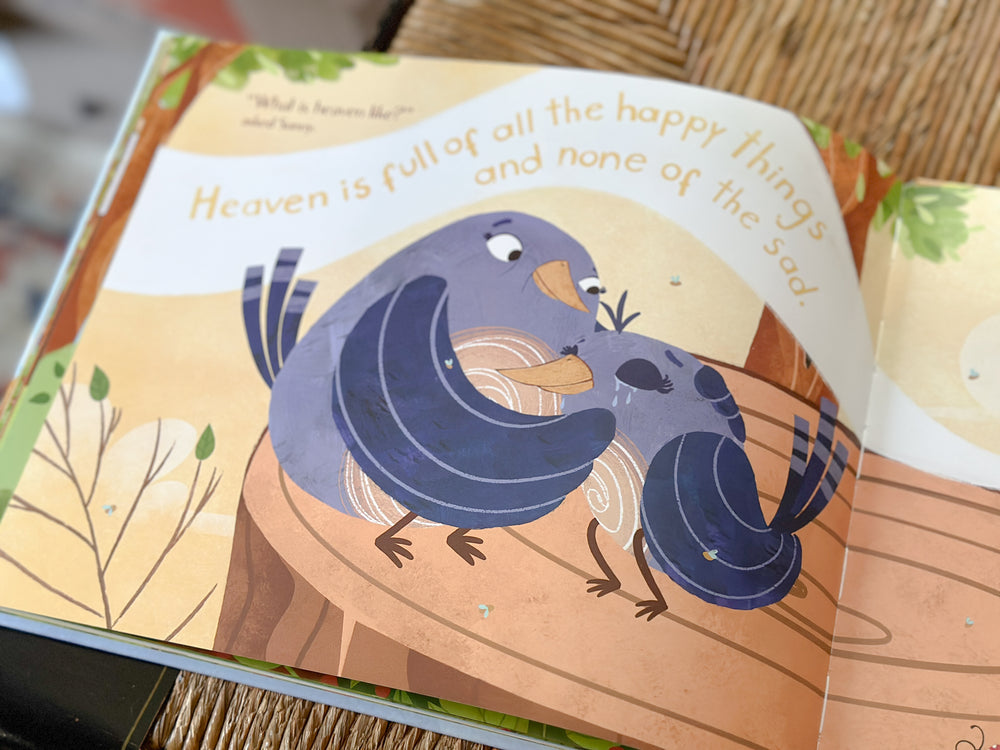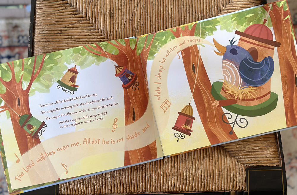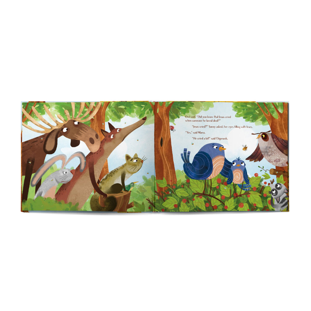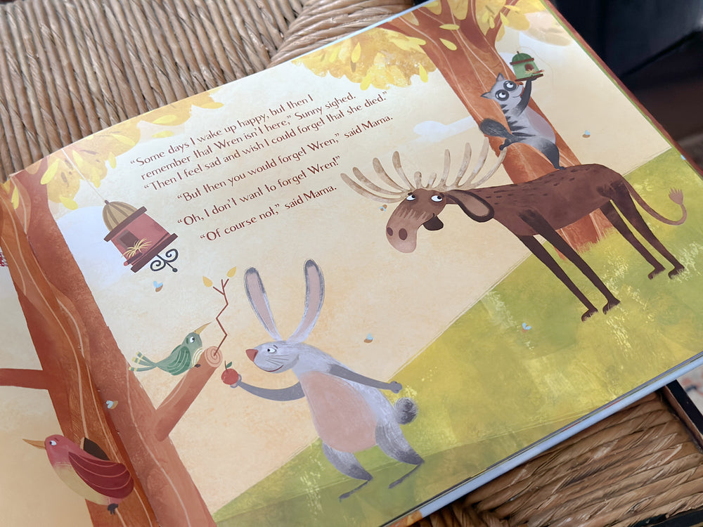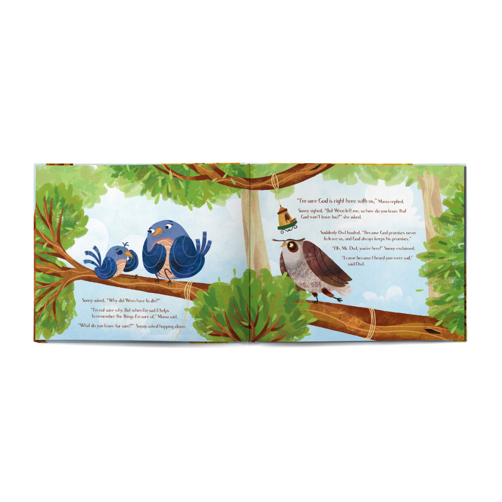 Sunny is a little bluebird who loves to sing happy songs until the death of Wren. Sunny's heart hurts because she misses her friend, and she doesn't feel like singing anymore. But Sunny's Mama and forest friends gather around her, teaching her how to share her sadness with God and others. Sunny learns to remember what she can count on about God's love and care and all the love she shared with Wren.