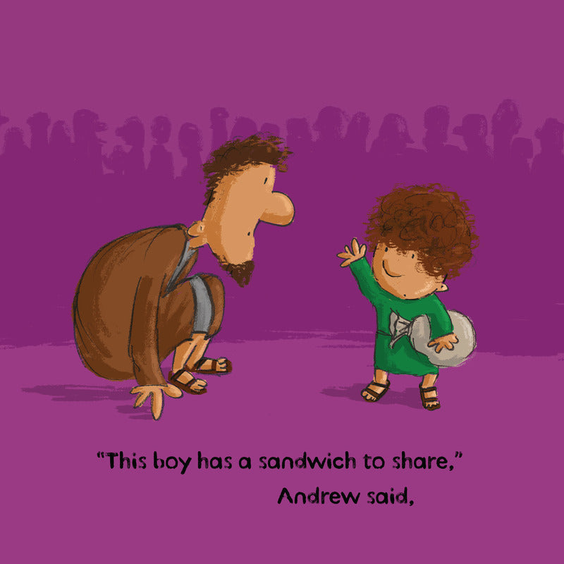 Thousands of people came to Jesus--and they were all hungry. But one boy had a sandwich to share. So Jesus prayed and then shared the sandwich with the huge, hungry crowd. Everyone was amazed and wanted him to be King.